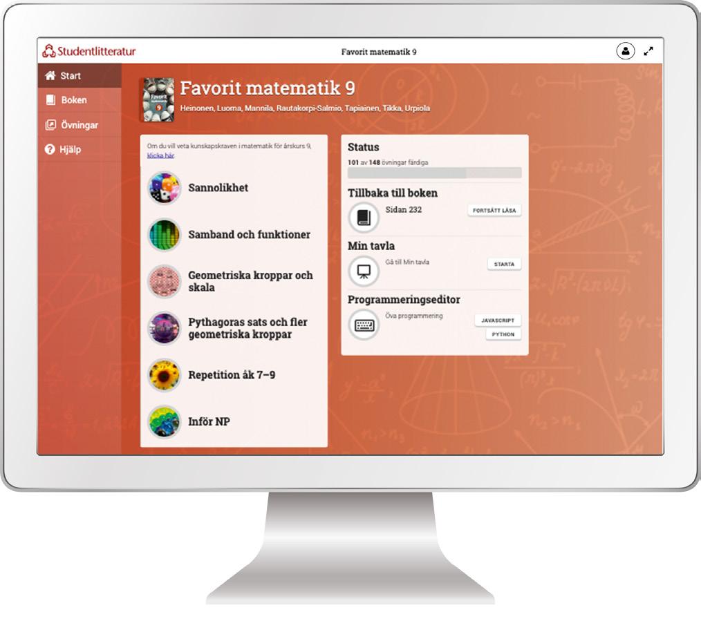Det digitala läromedlet består av elevboken i digital form med alla texter inlästa. Här finns även filmade genomgångar och räkneexempel samt en stor mängd extra uppgifter på olika nivåer. Repetitionsuppgifterna finns som interaktiva uppgifter. Det finns även programmeringsövningar i Python och Javascript med tilllhörande editor, samt instruktioner och filmer till båda programmeringsspråken.