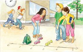 1. Hur många bollar ser du på bilden? (3) 2. Hur många kepsar ser du på bilden? (4) 3. Hur många barn ser du på bilden? (5)