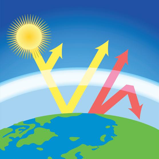 2. En del av värmen strålar ut i rymden. En del av värmen tas upp av växthusgaser. Växthusgaserna hindrar värmen från att stråla ut i rymden.