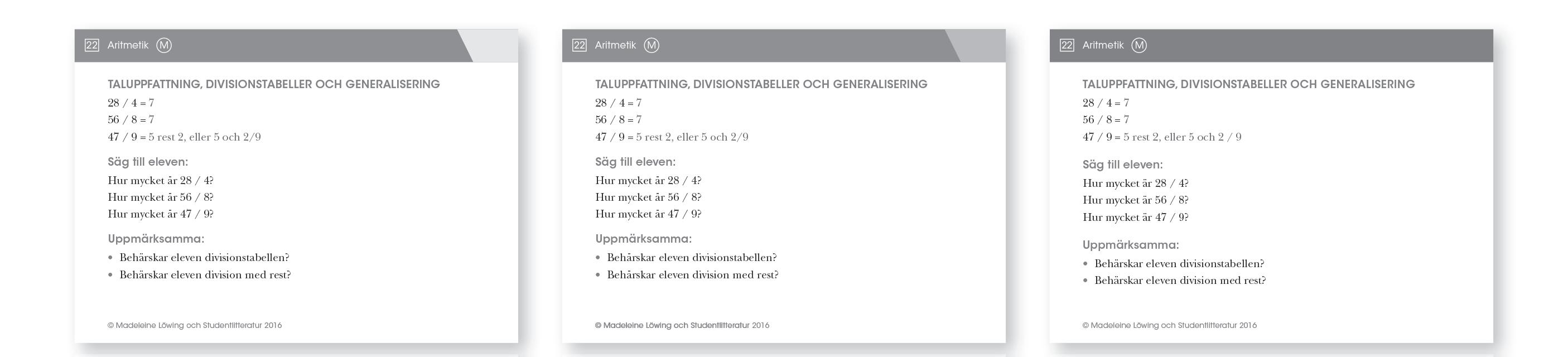 Vid kartläggningen håller du kortet emellan dig och eleven under samtalet. Eleven ser uppgiften och du kan läsa instruktioner som stödjer samtalet och underlättar bedömningen av elevens kunskaper. Syftet med detta är att du lätt ska kunna komma ihåg vad som ska efterfrågas och uppmärksammas när det gäller just den uppgift som finns på kortet.