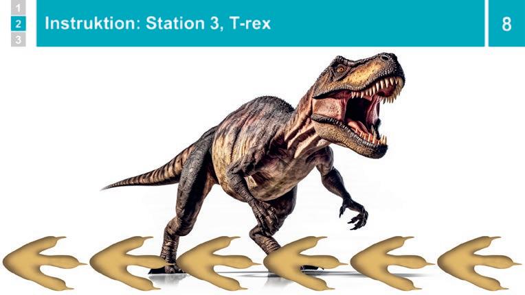 Station 3, T-rex: De ska använda fotavtrycket från en T-rex för att mäta ut om en T-rex skulle få plats i klassrummet. Berätta att just den här var 17 T-rexfötter lång och åtta T-rexfötter hög.