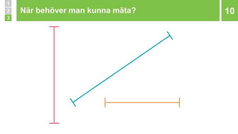 Om eleven svarar att linjen med rät vinkel är kortast så kan det bero på att hen har mätt fågelvägen mellan ändpunkterna. Om eleven svarat att den sneda linjen är längst så kan det bero på att eleven tror att den automatiskt är längst eftersom den är placerad högst upp på pappret. Det är också möjligt att elever som har fel har nöjt sig med att uppskatta längden med hjälp av ögonmått istället för att genomföra en ordentlig mätning med hjälp av snöret. Undersök vad eventuella felsvar beror på genom att låta eleven göra en liknande uppgift då du kan observera vad eleven gör och ställa frågor.