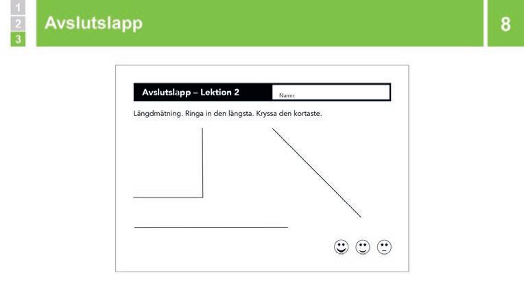 Avslutslappen låter eleverna visa om de kan använda sig av ett jämförelseobjekt för att göra indirekta jämförelser mellan föremål som inte läggs intill varandra. Genom att använda ett snöre kan eleven mäta en linje och sedan jämföra med övriga, och på så sätt avgöra vilken som är längst respektive kortast. Den vågräta linjen är 22 cm lång, linjen med rät vinkel är 20 cm och den sneda linjen är 18 cm.