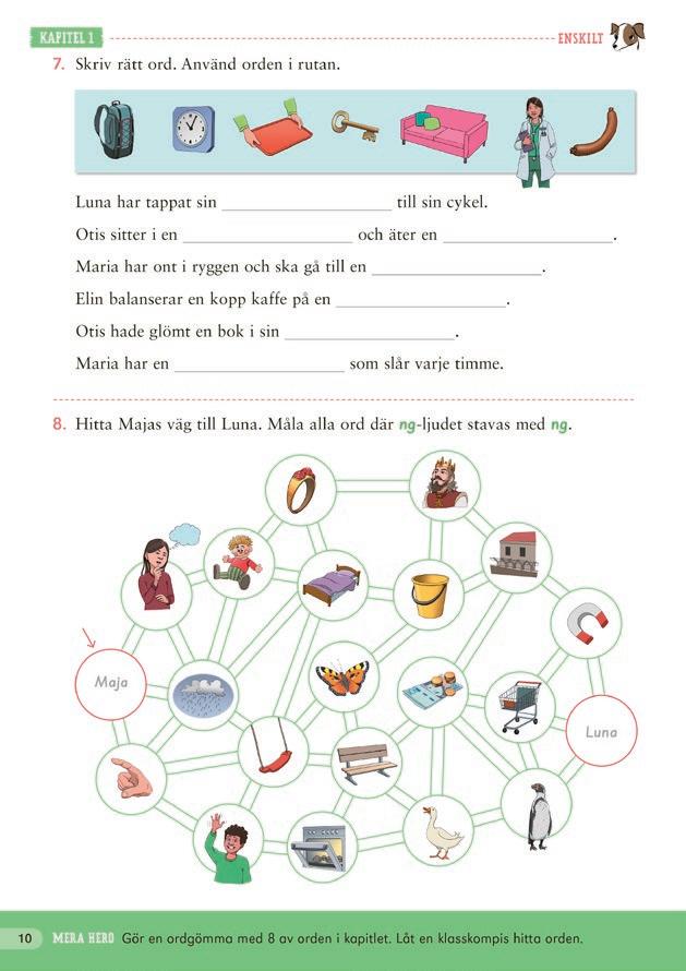 8. Hitta Majas väg till Luna. Måla alla ord där ng -ljudet stavas med ng .