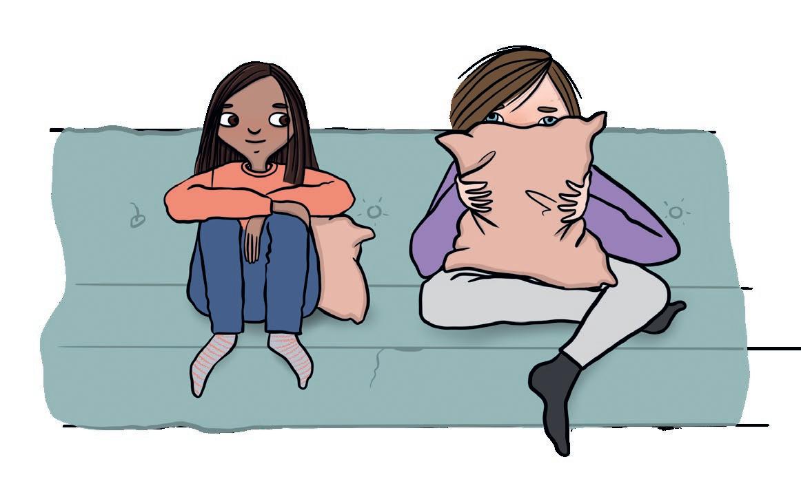 d) Vilka står bredvid Alma i klassrummet?