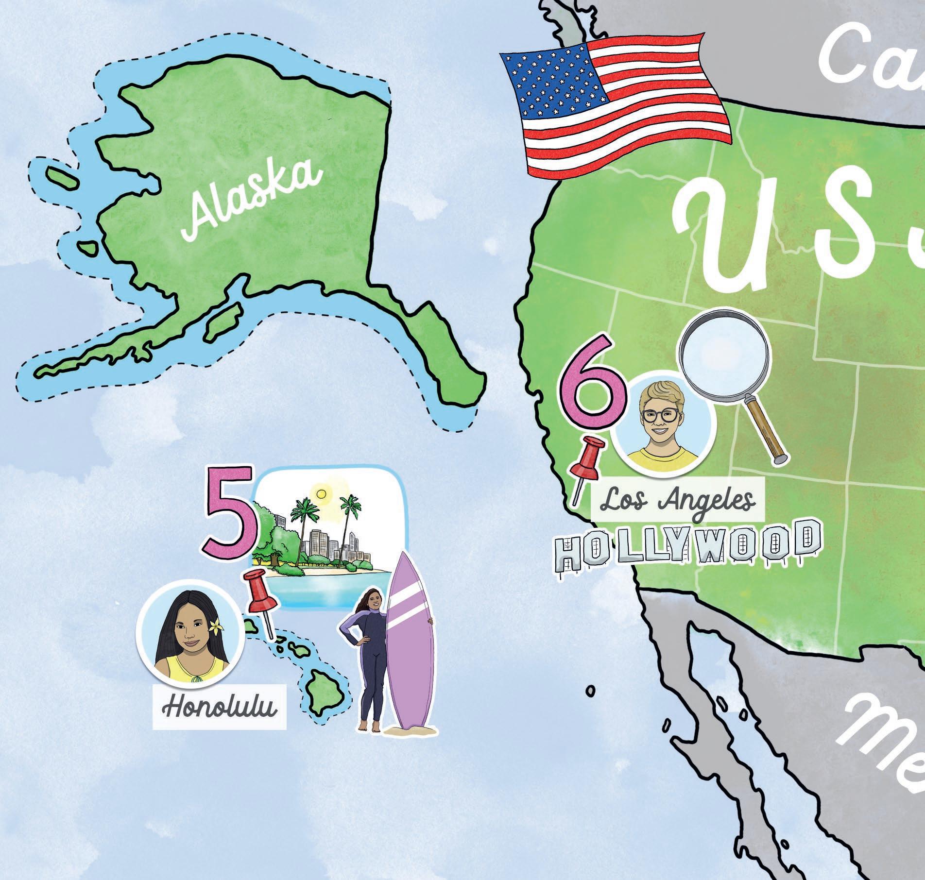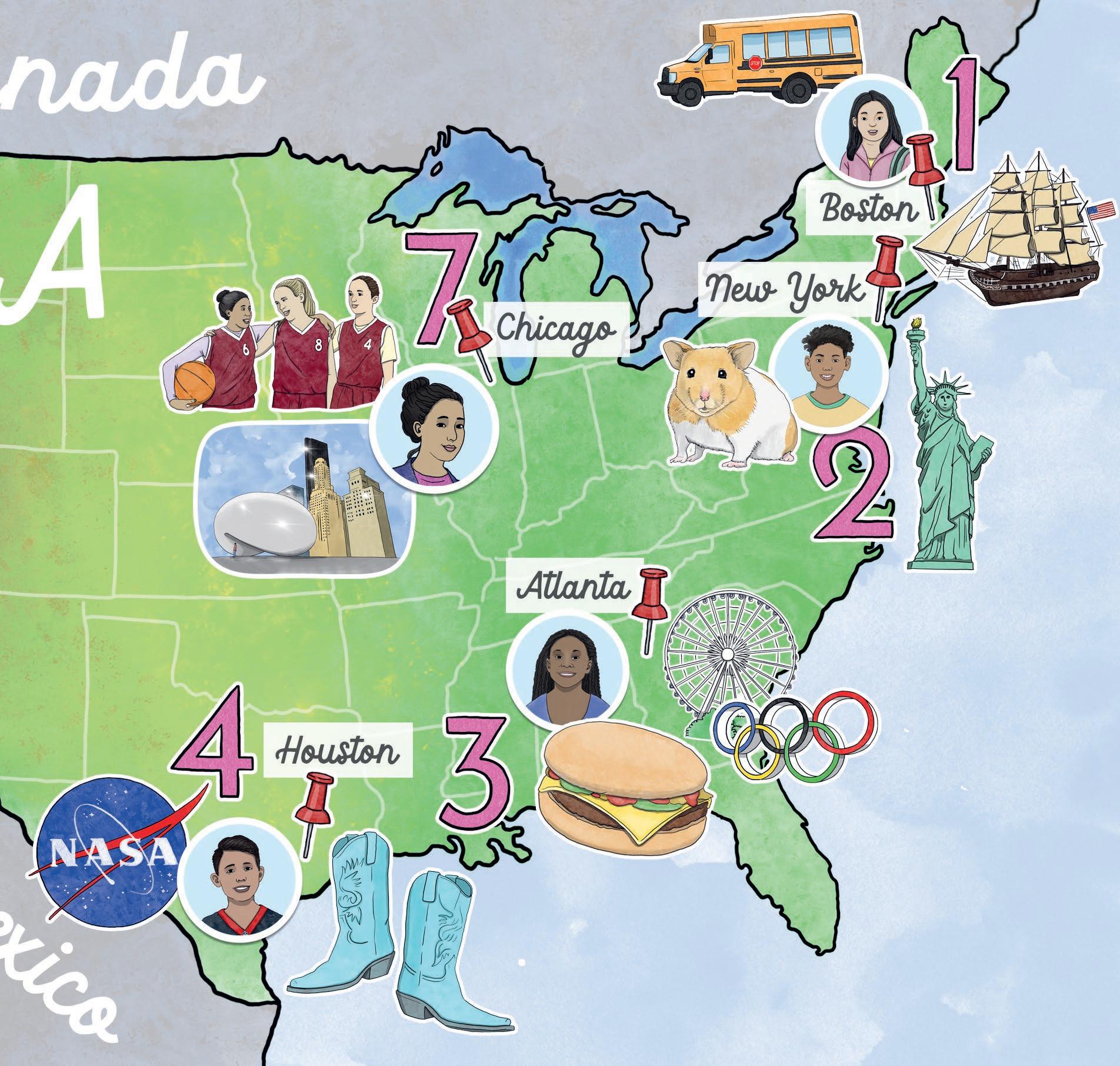 Boken har sju kapitel och varje kapitel har ett tema och en huvudperson, ett barn från en stad i USA, som berättar om sin vardag. I kapitlet tränas alla färdigheter. Eleverna möter kortare texter för läsförståelse, hörförståelseövningar samt uppgifter för att tala och skriva. Stödstrukturer, modelltexter och övningar förbereder eleverna väl för att de ska kunna uttrycka sig på egen hand. Dessutom finns det integrerade övningar för ordkunskap och grundläggande grammatik.