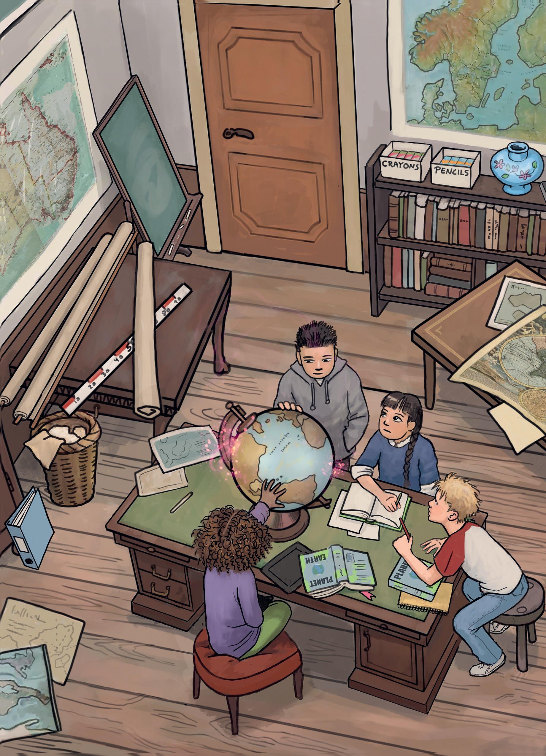 Liam’s eyes opened wide. He wobbled in the air and laughed. What else could he do? He always laughed at things he didn’t understand. And this just couldn’t be explained. One minute, they had been in the map room, playing with the globe. And now …
