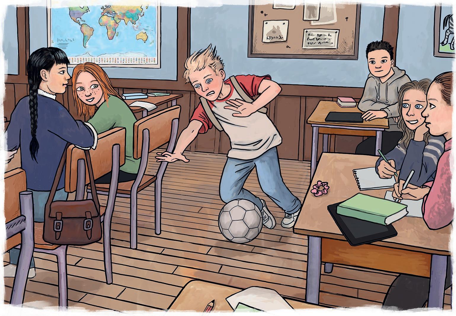 ‘Liam!’ The teacher shook her head. ‘How many times have I told you not to bring your football into the classroom? Leave it with me, please. You may have it back after school’.