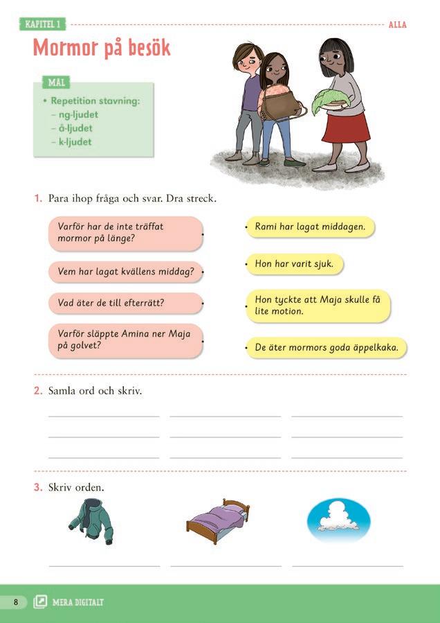 Det digitala läromedlet innehåller läseböckernas texter inlästa med textföljning. Det finns också övningar som tränar ord och begrepp samt läsförståelse utifrån texternas innehåll. Arbetsbokens och skrivbokens innehåll kompletteras med övningar som bland annat övar ord och begrepp, läsförståelse, stavning samt ordklasser.
