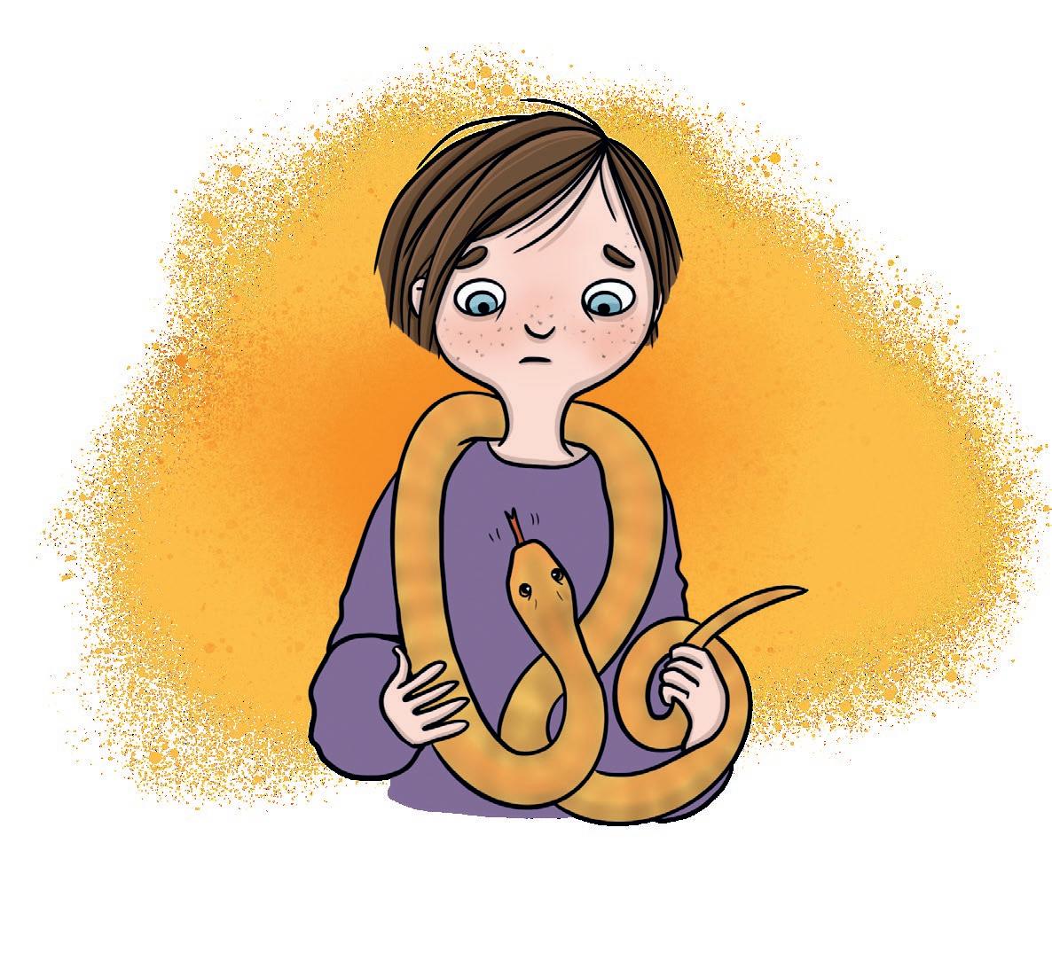 Luna ger djuren lite vatten. När hon är klar tar hon upp Maja. Hon är så vackert orange. Ögonen är runda och tungan är röd. Tungspetsen är kluven i två delar.
