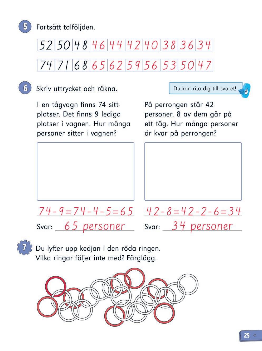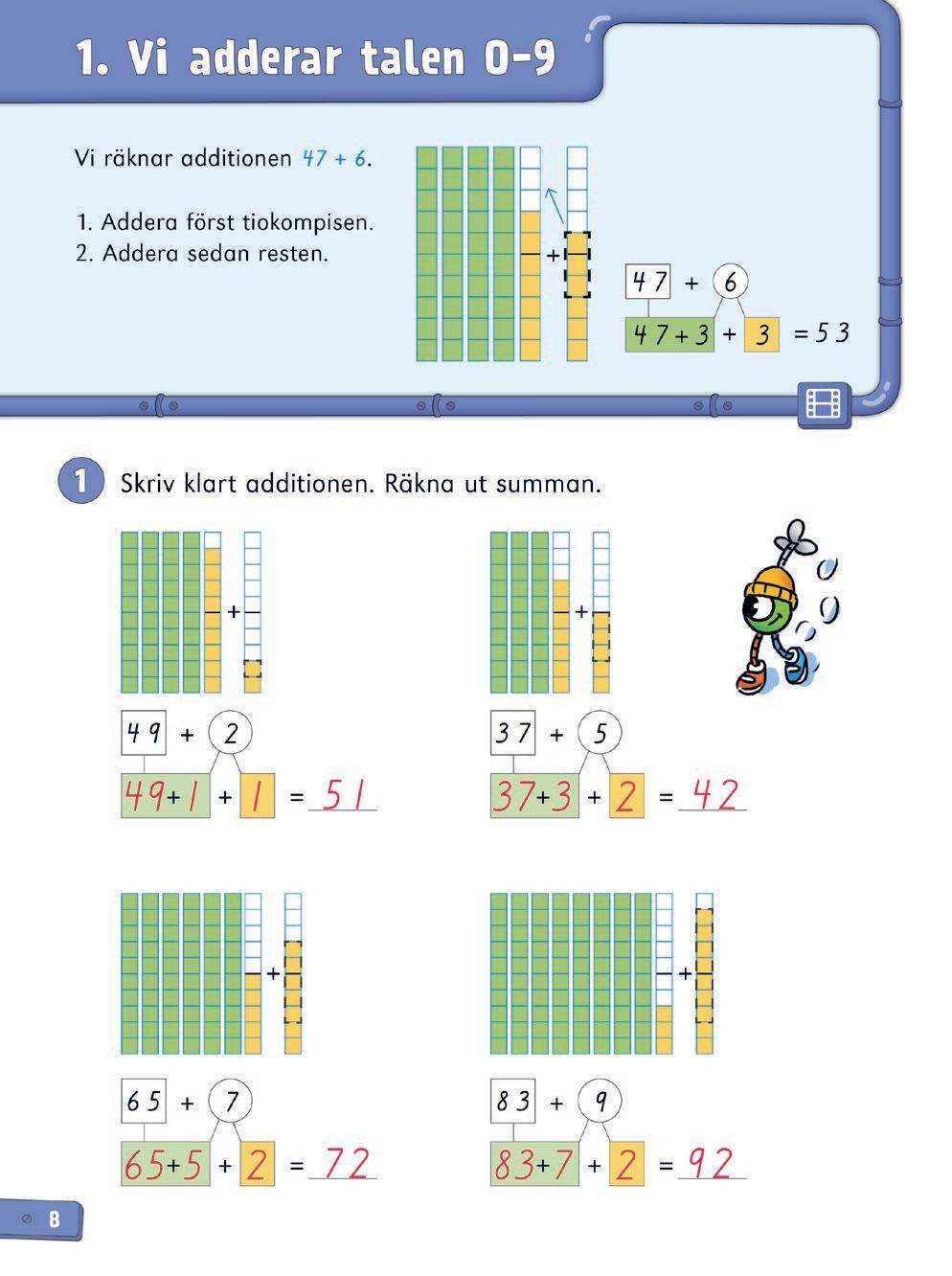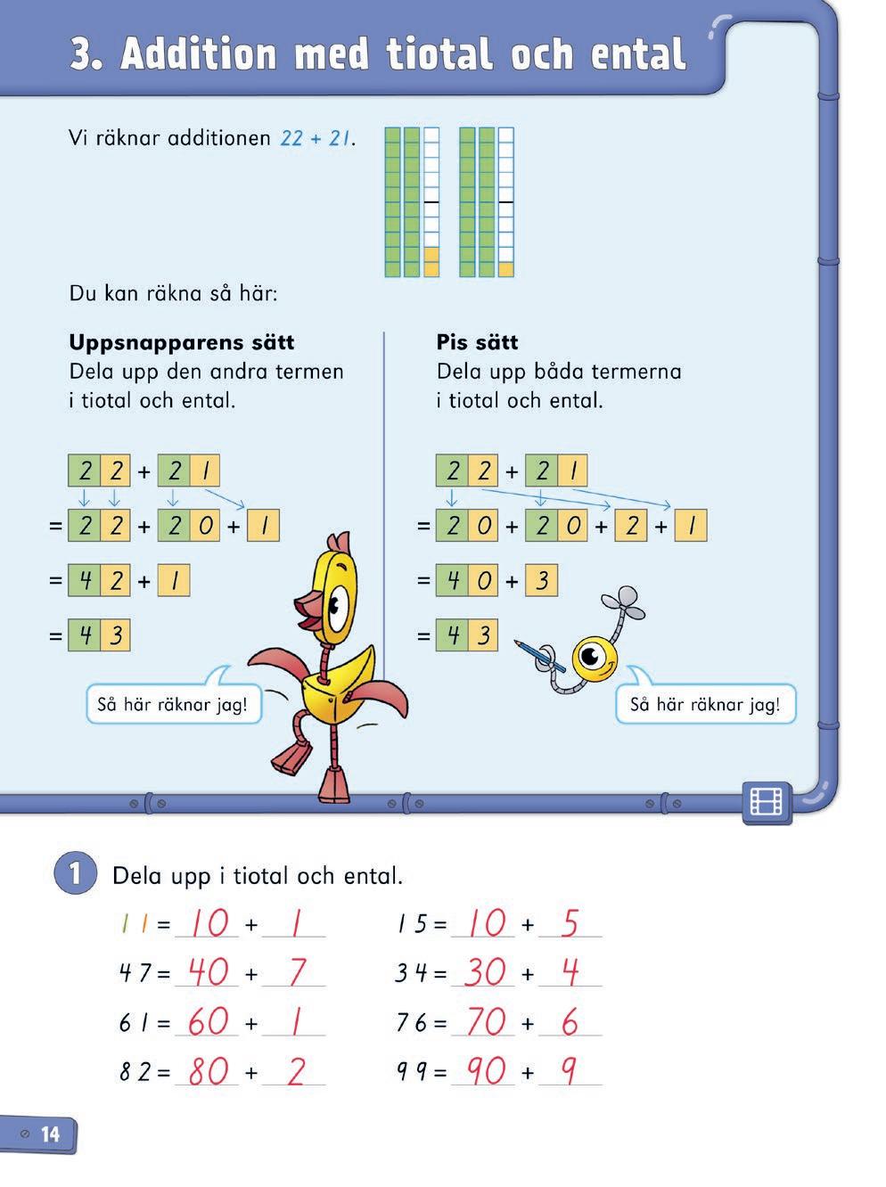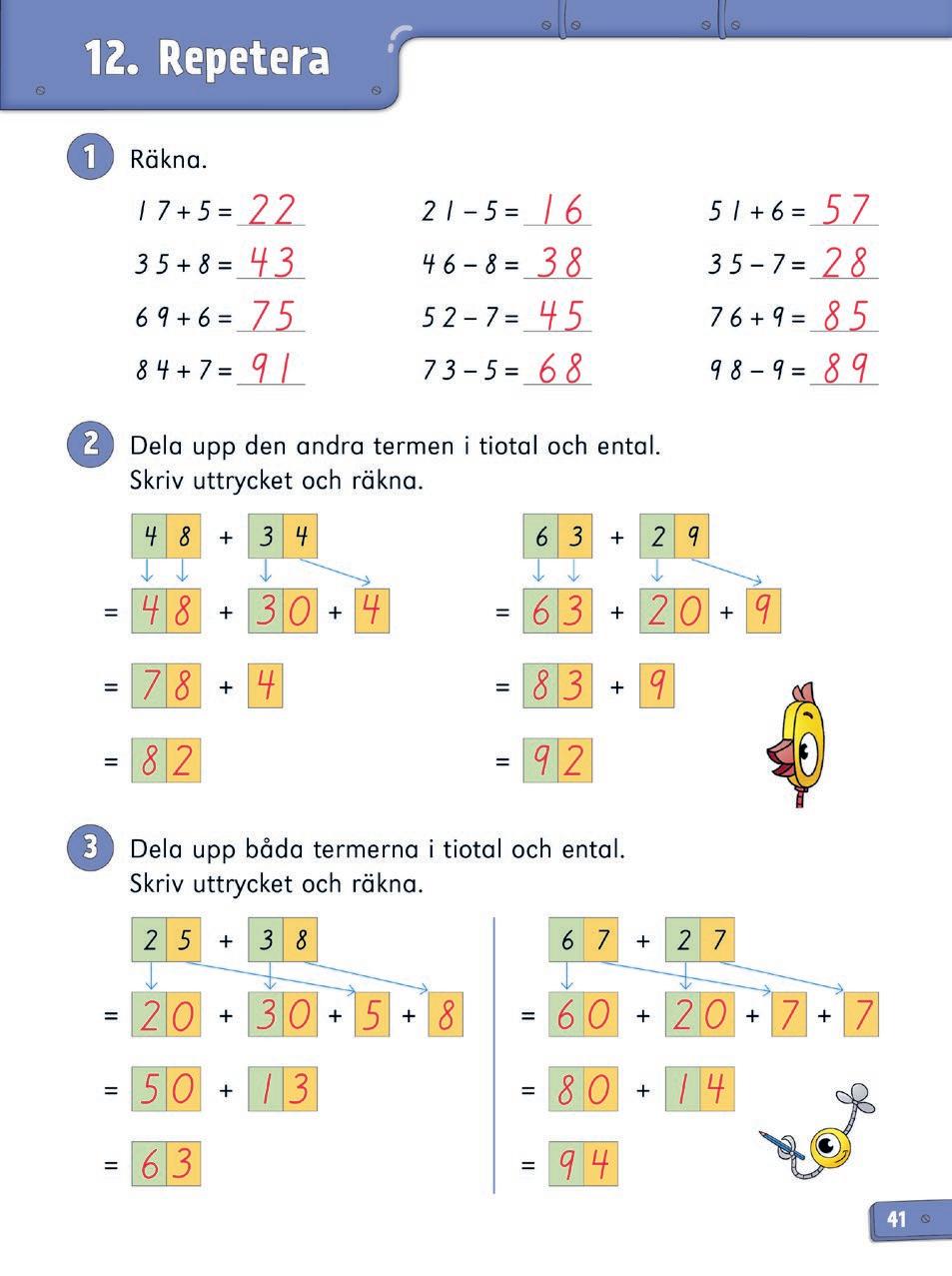 Repetitionslektionen kan användas på olika sätt. Utöver repetition kan den bland annat fungera som ett slags diagnos på innehållet i kapitlet. Om eleven har förstått innehållet i kapitlet, men uppgifterna i repetitionslektionen ändå är utmanande (hen räknar t.ex. långsamt, är osäker eller gör många fel) är det viktigt att stanna upp och repetera. Ge eleven tid att träna mer för att befästa. Använd även det laborativa materialet tillsammans med kopieringsunderlagen till kapitlet när ni repeterar.