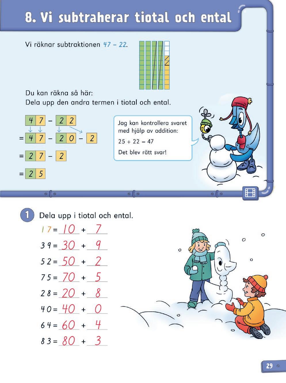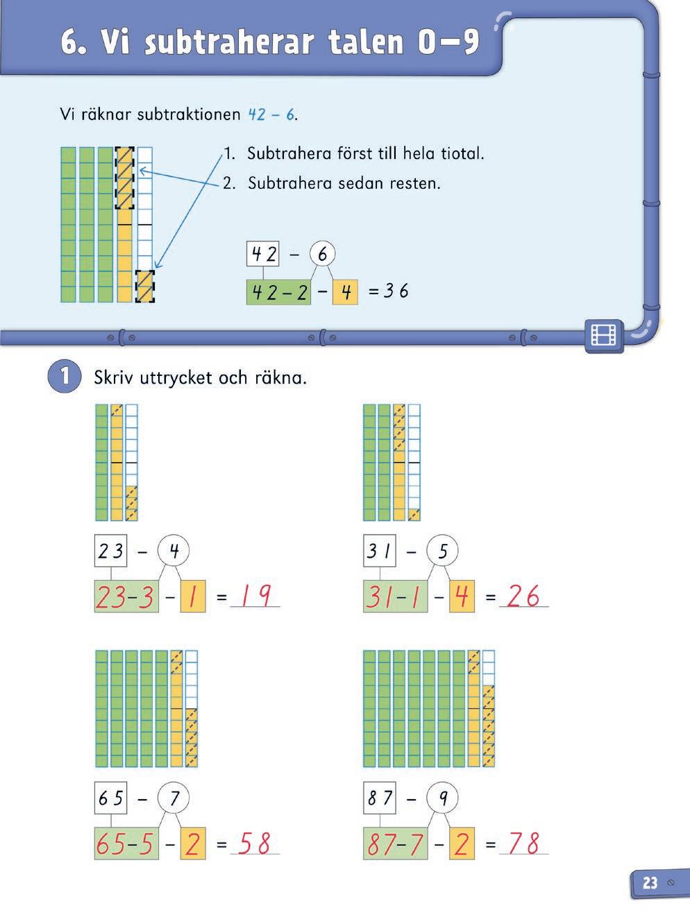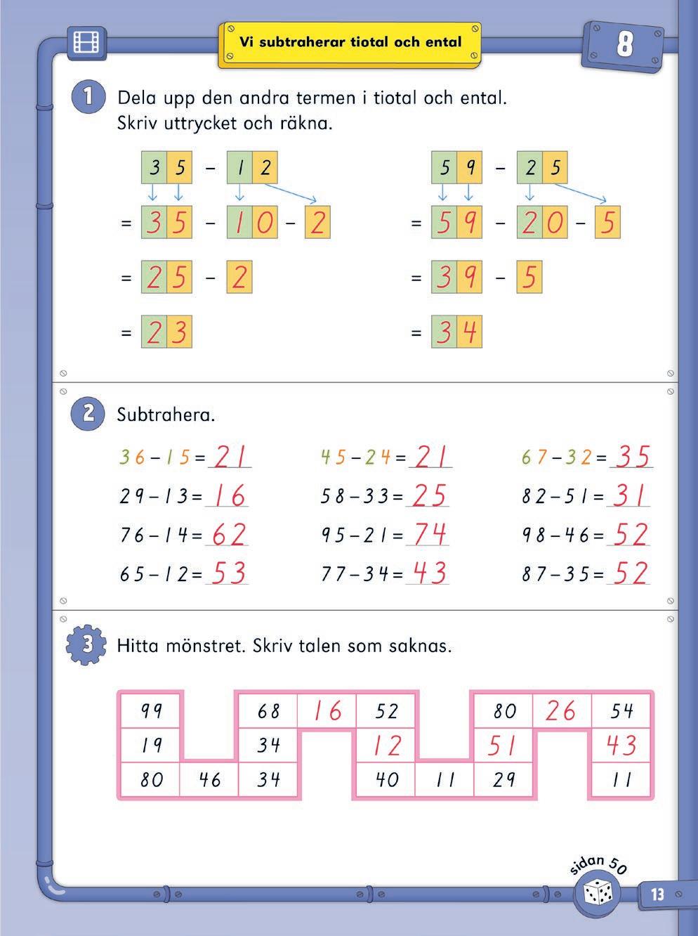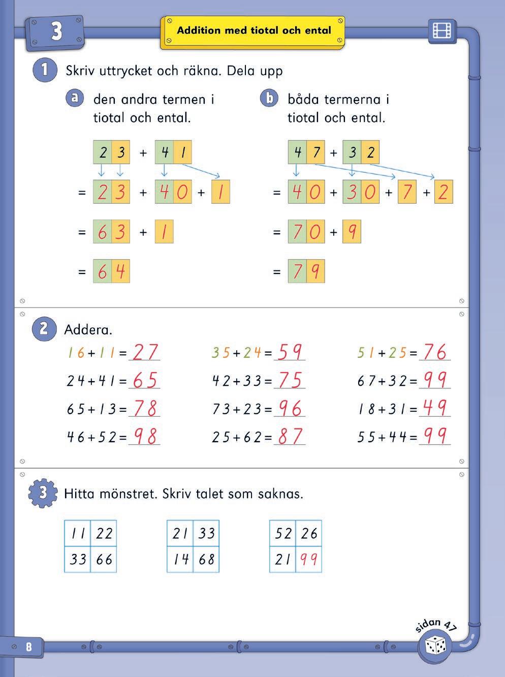 Repetitionslektionen kan användas på olika sätt. Utöver repetition kan den bland annat fungera som ett slags diagnos på innehållet i kapitlet. Om eleven har förstått innehållet i kapitlet, men uppgifterna i repetitionslektionen ändå är utmanande (hen räknar t.ex. långsamt, är osäker eller gör många fel) är det viktigt att stanna upp och repetera. Ge eleven tid att träna mer för att befästa. Använd även det laborativa materialet tillsammans med kopieringsunderlagen till kapitlet när ni repeterar.