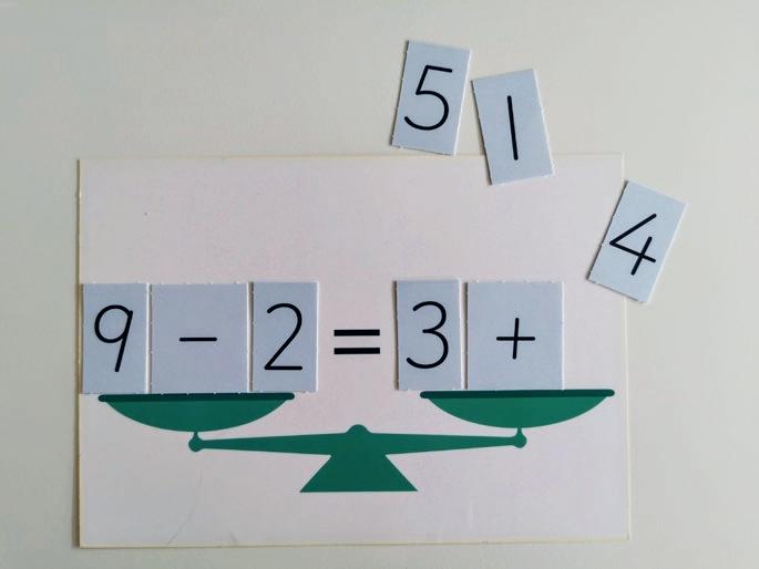 6 Stryk siffrorna som används efterhand. Börja med de uträkningar som saknar en siffra (6 + _ = 9, _ + 7 = 7 och _ – 3 = 5).