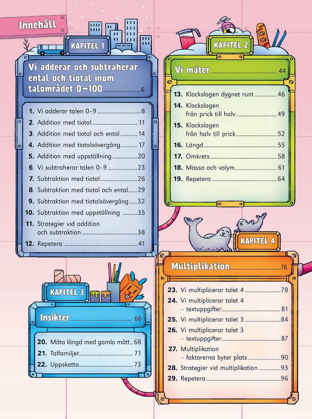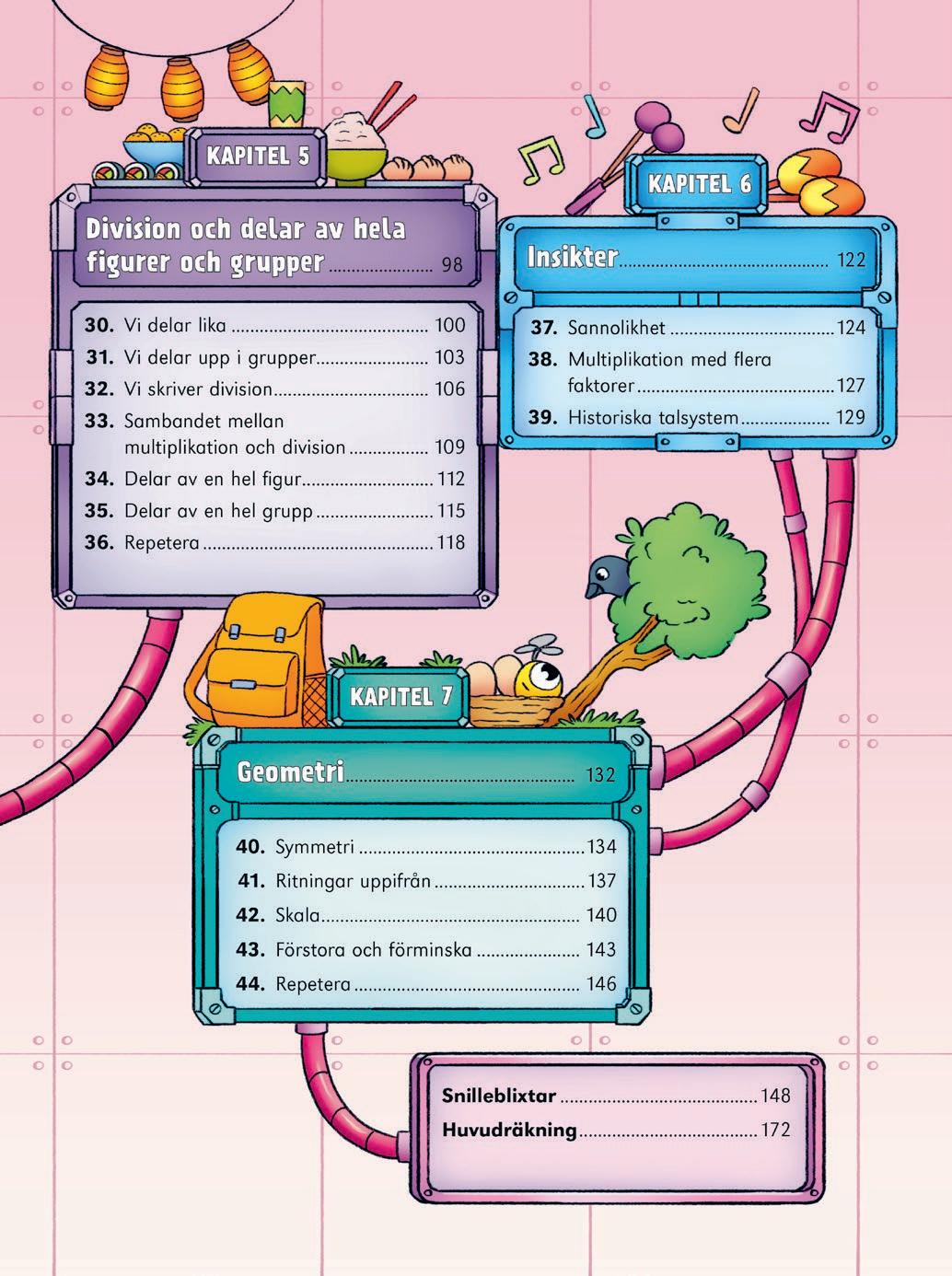 Matteblixt bygger på kapitel som delas in i lektioner. Här får du en tydlig överblick över det material du har att använda för att variera din undervisning med Matteblixt