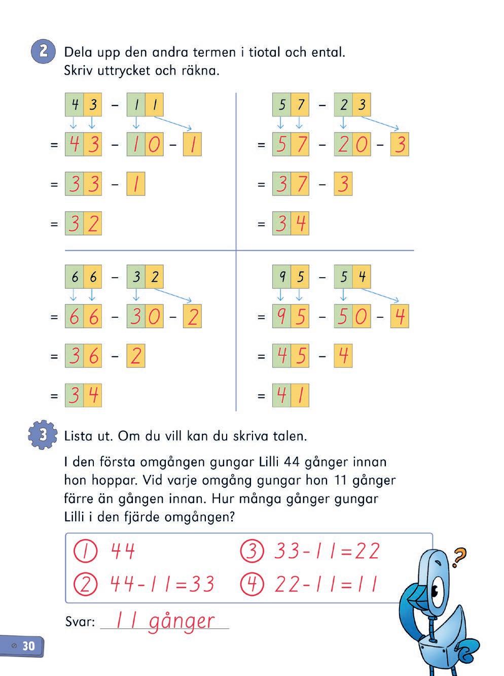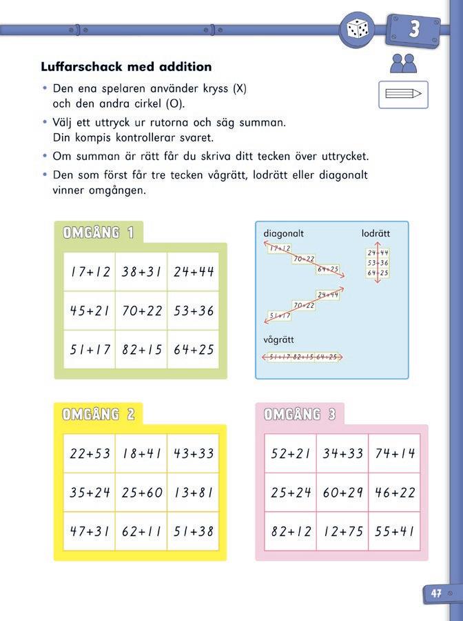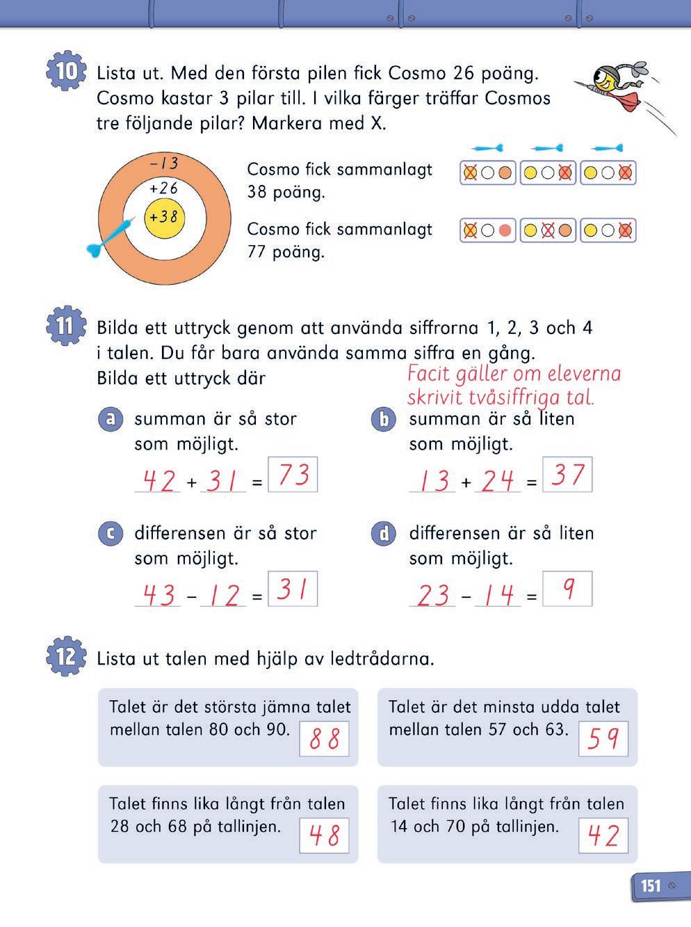 10 Uppmärksamma eleverna på att piltavlan innehåller både addition och subtraktion, dvs. man kan både få och förlora poäng. Tipsa eleverna om att först ta reda på hur många poäng som saknas efter att Cosmo kastat sin första pil. I den första uppgiften saknas 12 poäng (38 – 26 = 12). I den andra uppgiften saknas 51 poäng (77 – 26 = 51). Sedan kan eleverna testa sig fram.