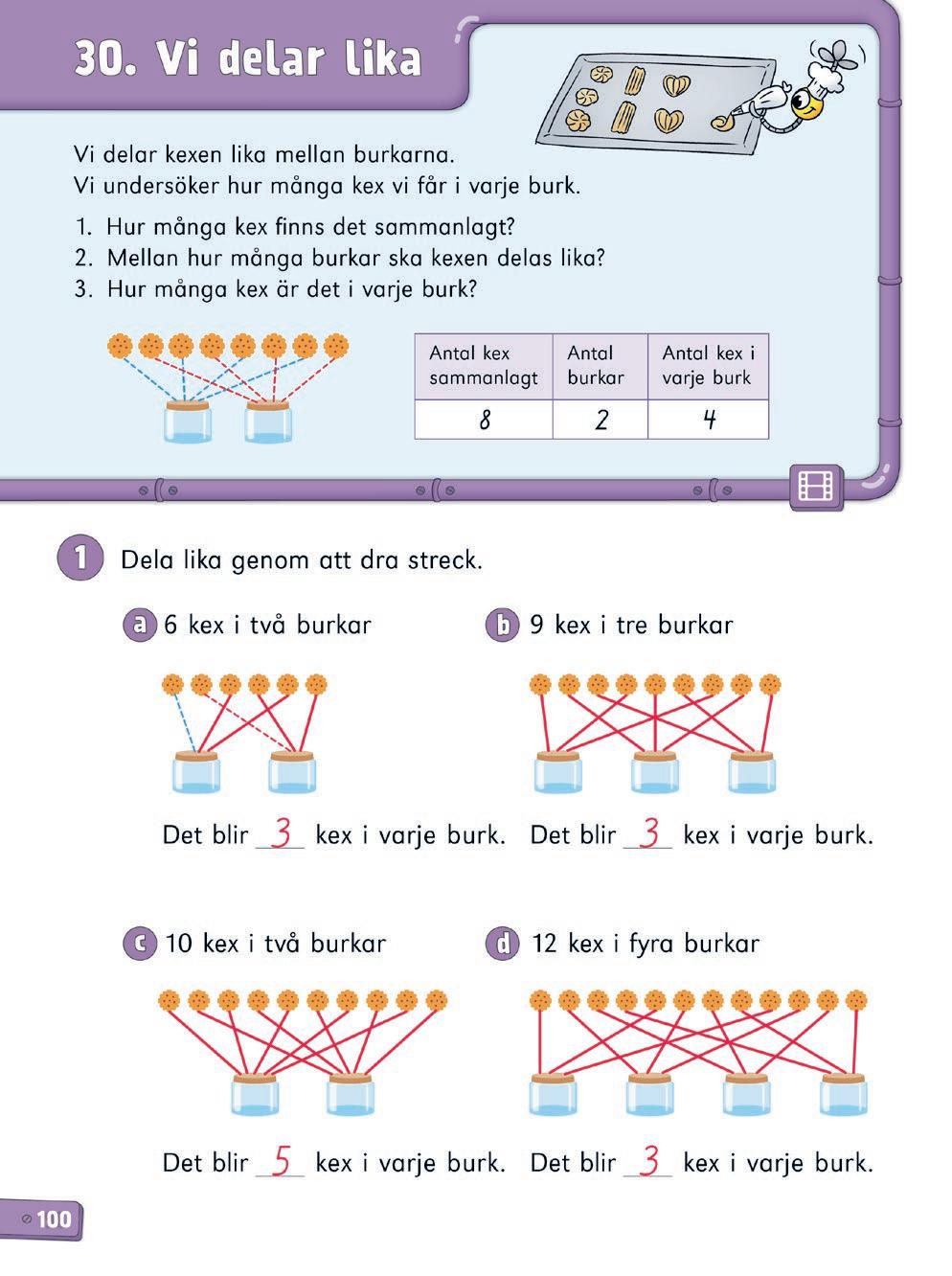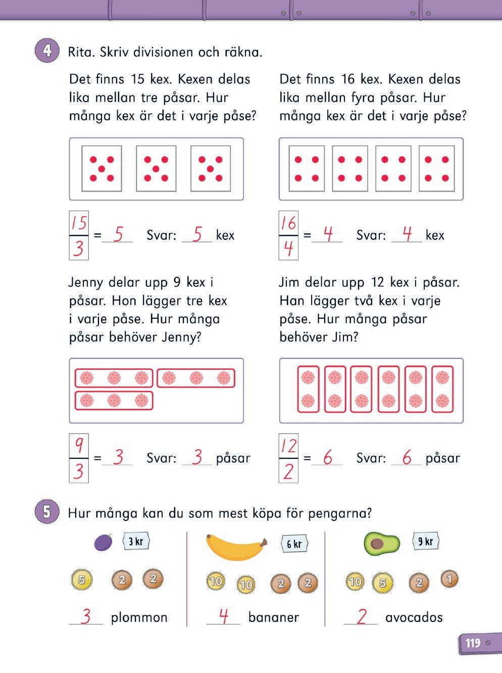 3 I ett kexpaket finns 15 kex Alex, Milo och Lea delar dem lika Hur många kex får varje barn? (5)