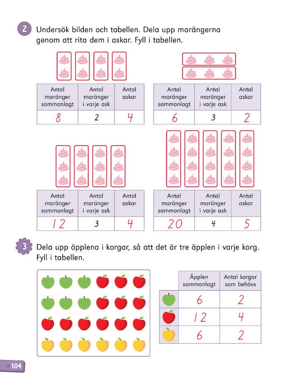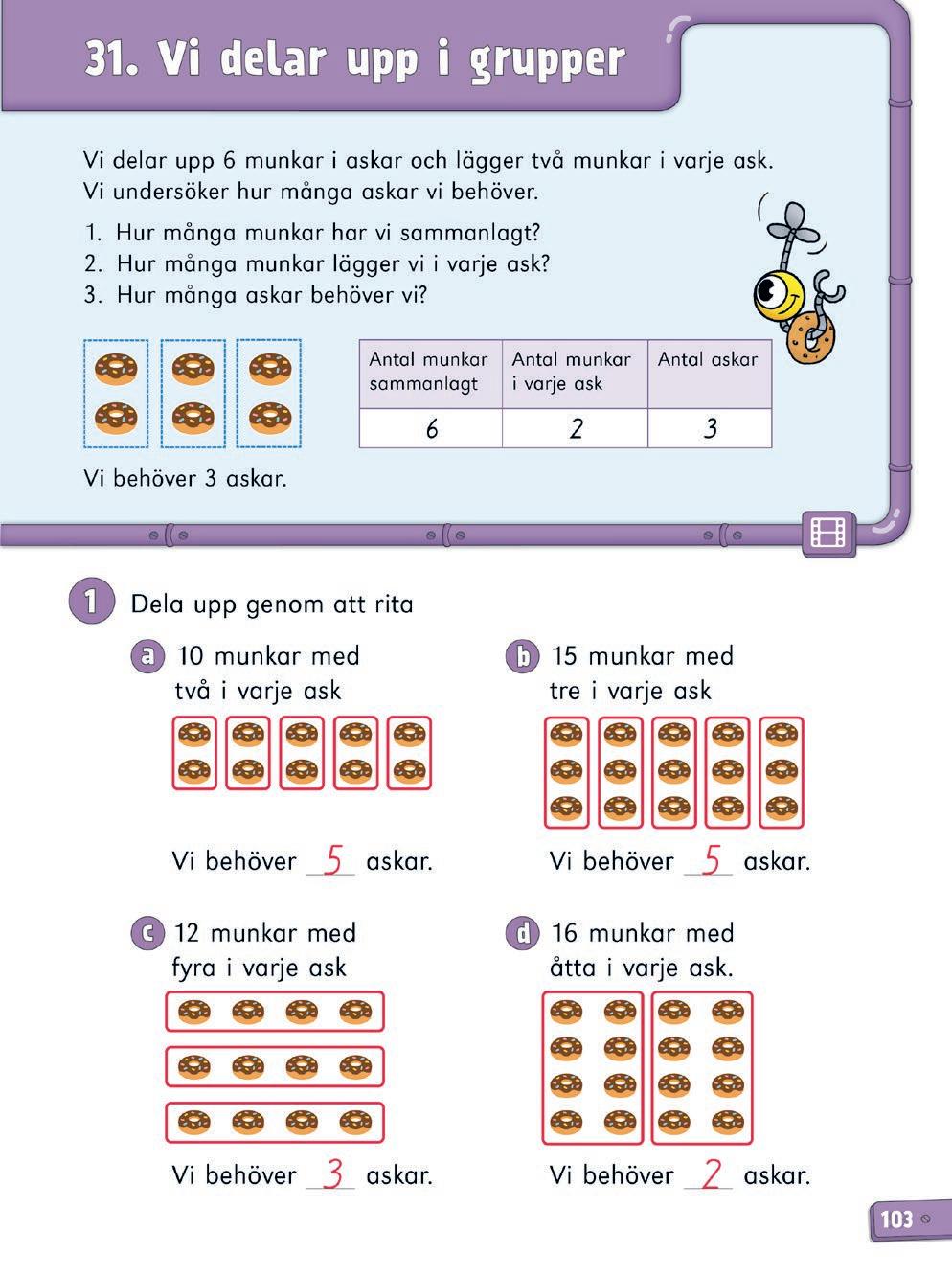 I lektionen bekantar eleverna sig med innehållsdivision. Vid innehållsdivision känner man till det totala antalet som ska delas och antalet i varje grupp. Svaret anger hur många grupper det finns. Det är viktigt att eleven får erfarenheter av både delnings och innehållsdivision. Eleven behöver förstå innehållsdivision i ett senare skede t.ex. då ett heltal divideras med ett tal i bråkform. Utnyttja vardagssituationer vid delningar i grupper med bestämd storlek. Synliggör delningen med hjälp av elever, föremål eller genom att rita. Fundera tillsammans på i vilka situationer i vardagen som eleverna behöver dessa färdigheter. Det är bra att använda föremål som stöd när eleverna arbetar med uppgifterna. Elevbok s. 103-105