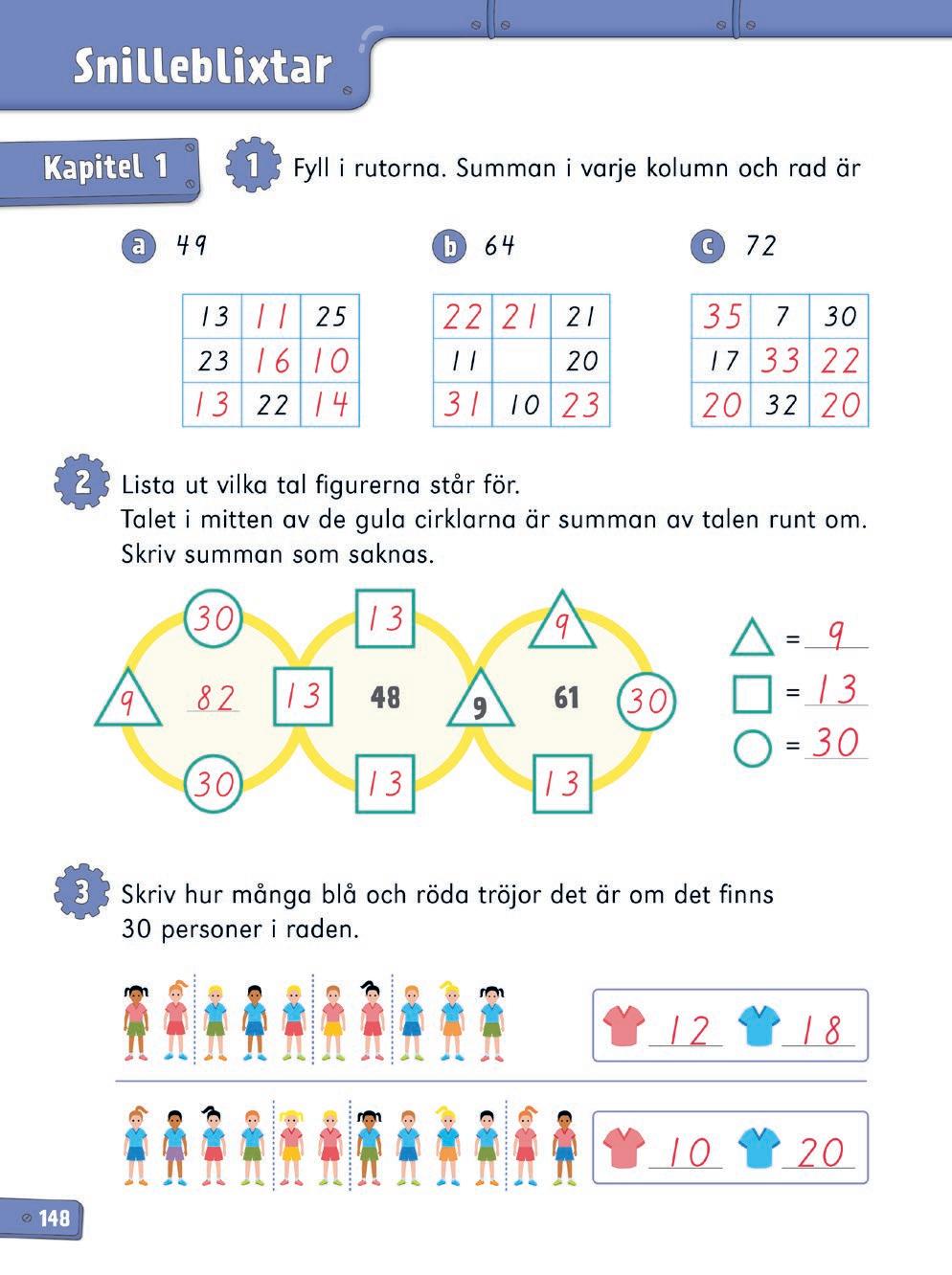 2 Påminn eleverna om att samma figur står för samma tal. Eftersom triangelns värde redan är givet (9) så kan man börja med att skriva in det värdet i alla tomma trianglar. Tipsa sedan eleverna om att börja i den cirkel där det är flest likadana figurer (mittcirkeln). Summan av talen i denna cirkel ska vara 48. Triangeln är värd 9. Det blir då (48 – 9 =) 39 kvar som ska fördelas lika mellan tre kvadrater. (39 / 3 = 13).