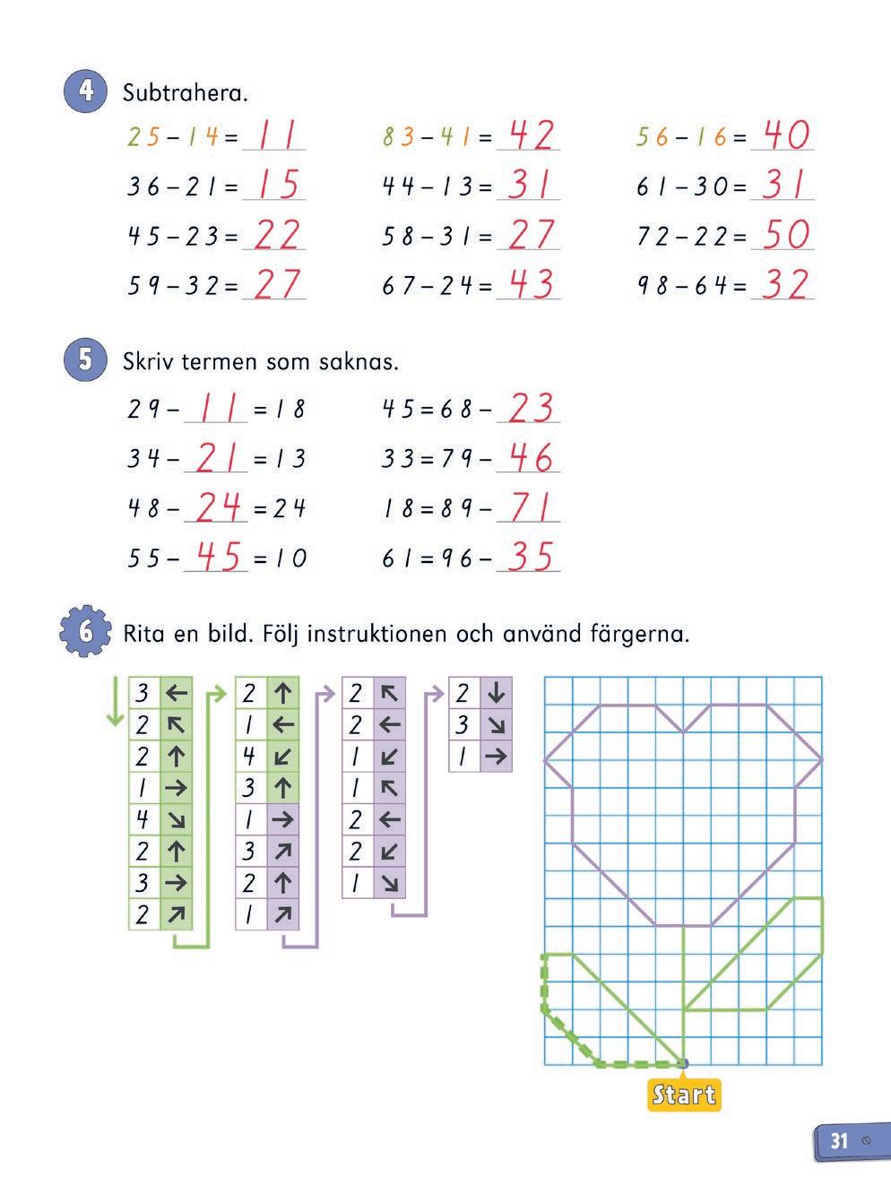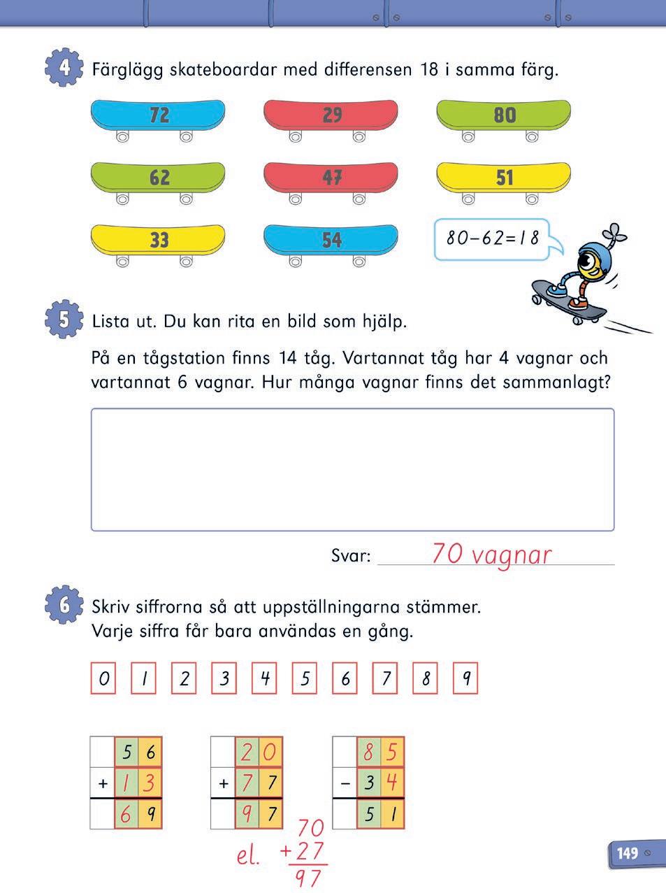 4 Välj två skateboardar och se om differensen är ca 20. Addera sen 20 till den skateboard med lägst tal och subtrahera 2. Färglägg om talet på den andra skateboarden stämmer. Annars försöker eleven med nya skateboardar.