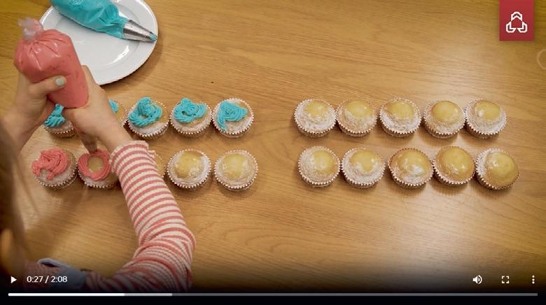 Lägg 10 färgcirklar i en rad. Undersök det sammanlagda antalet cirklar och skriv in det i tabellen (10). Undersök tabellen och lägg två cirklar åt gången i varje muffinsform.