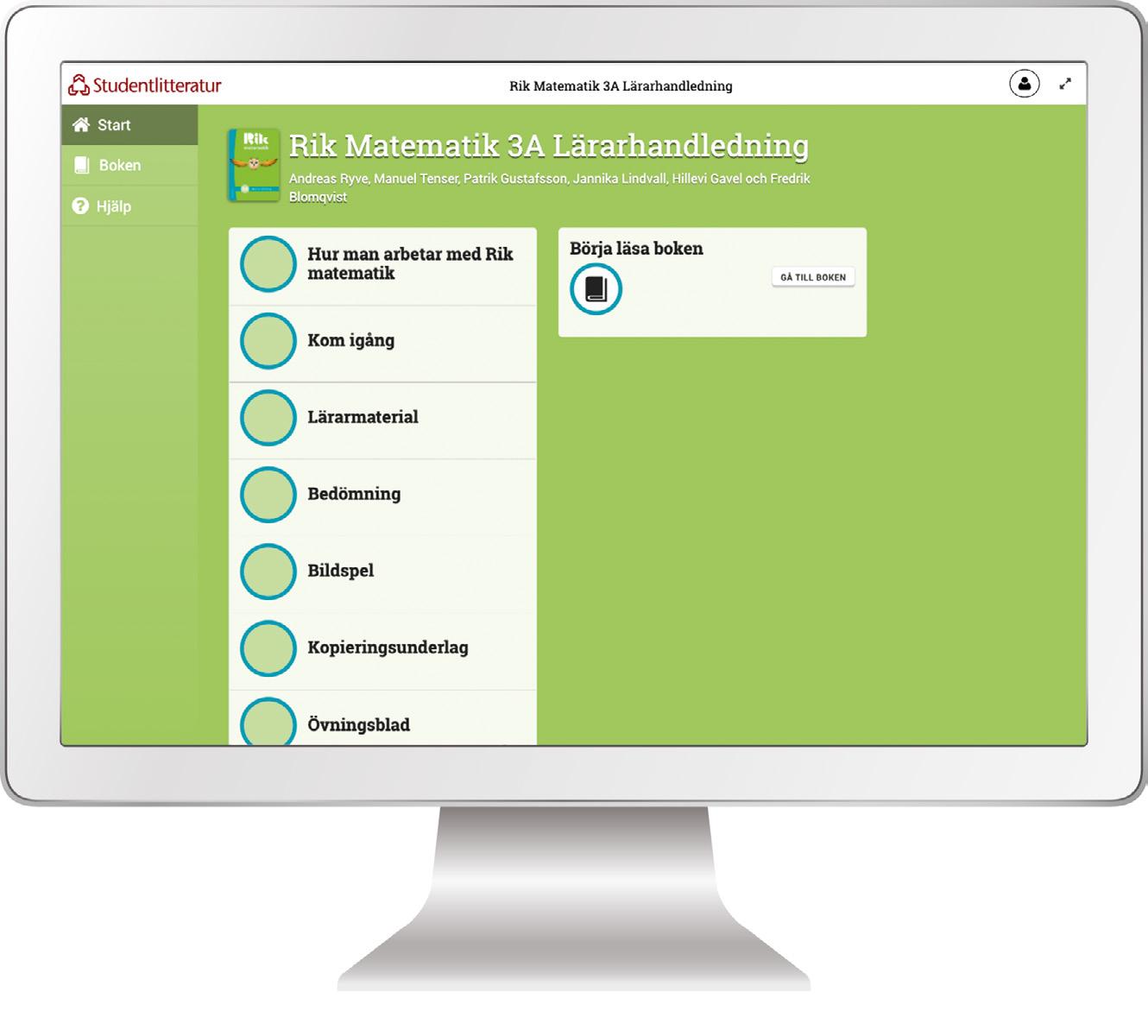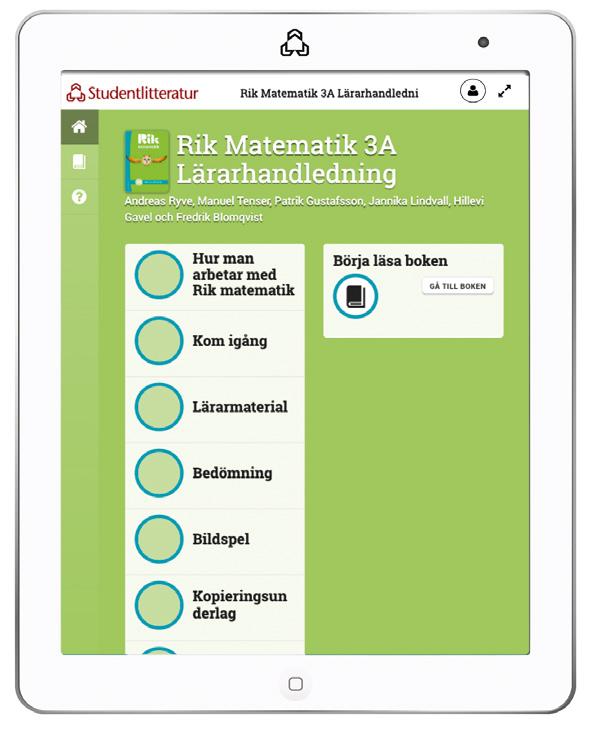I Rik matematik 3A Lärarpaket ingår utöver det tryckta lärarmaterialet, även en digital lärarresurs samt tillgång till förberedda uppdrag i Tomoyo, en digital spelifierad färdighetsträning. De digitala delarna nås via Min bokhylla på Studentlitteratur.se