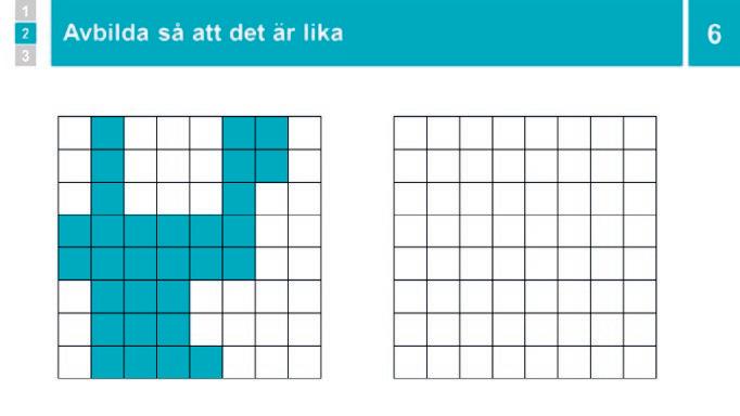 Du visar en figur i ett rutnät. Eleverna får säga vilka rutor i ett tomt rutnät bredvid som ska färgläggas för att en identisk figur ska skapas.