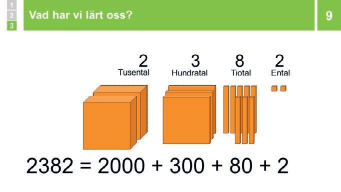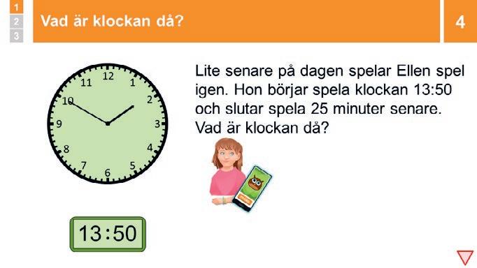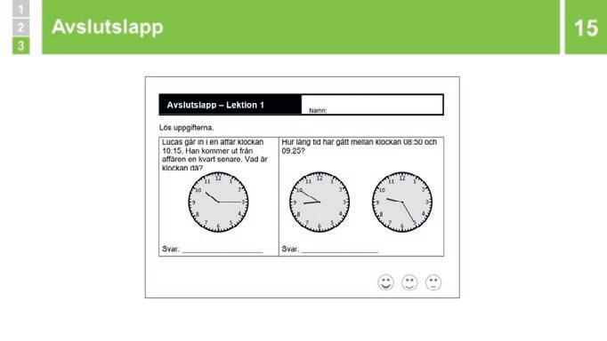 och här får eleverna möta innehållet i den nya lektionen, ofta genom en lärarledd genomgång med stöd av bildspelet. I aktivitetsfasen diskuterar, tänker, räknar och löser eleverna problem, ofta i grupp eller par. Läraren har en viktig roll under aktivitetsfasen i att utmana elever, ställa frågor för att uppmana tänkande och diskussion, samla information inför avslutningen av lektionen, etc. Naturligtvis finns det också tid för enskild färdighetsträning. I avslutsfasen sammanfattar du lektionen tillsammans med eleverna och lyfter upp den centrala matematiken. Ofta gör eleverna en avslutslapp där de får visa vad de lärt sig och samtidigt tänka igenom det mest centrala i lektionen.