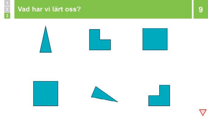 Du visar ett antal figurer. Eleverna försöker para ihop de figurer som har samma storlek och form. Du konstatera att två figurer som har samma storlek och form fortsätter att ha det även om figurerna vrids, flyttas eller spegelvänds.