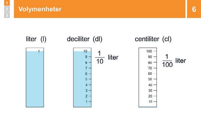 Volym kan mätas i enheterna liter, deciliter och centiliter. 10 dl är 1 l och 100 cl är också 1 l.