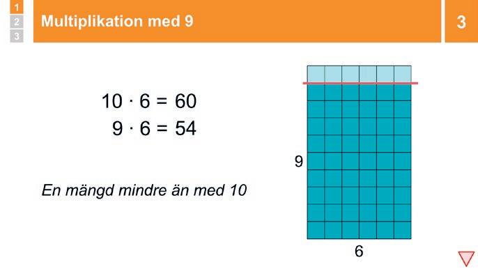Fortsätt: ”Den här strategin som fungerar vid multiplikation med 9 kallas En mängd mindre än med 10 Om man vill veta vad 9 ∙ 6 är så kan man tänka att det är 6 mindre än produkten av 10 ∙ 6 eftersom man har en sexa mindre (9 stycken istället för 10 stycken sexor)� Alltså är 9 ∙ 6 = 54�”