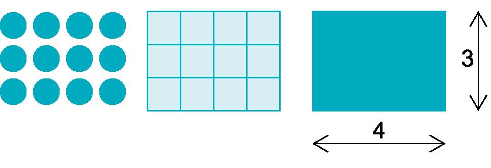 Multiplikation av heltal kan definieras som upprepad addition, men en mer generell tolkning är att se det som areabestämning för en rektangel. Nedan illustreras ”fyra gånger tre”, 4 3, fyra kolumner med tre i varje, eller arean hos en rektangel med basen 4 längdenheter och höjden 3 längdenheter.