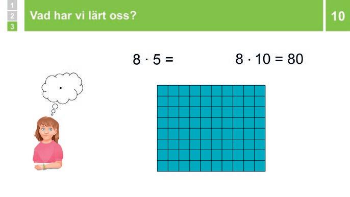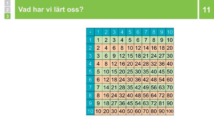 Visa multiplikationstabellen Visa hur den fungerar med exemplet 8 ∙ 9 Säg att ni nu har gått igenom räknestrategier för alla multiplikationer i 1:ans till 10:ans tabeller När man använt en räknestrategi för att tänka ut svaret på en multiplikation tillräckligt många gånger så kommer man till slut att veta vad produkten är utantill Det är bra att kunna alla multiplikationer upp till och med 10 ∙ 10 = 100� På så sätt kan man använda sin tankekraft mer för att tänka ut hur man ska lösa en uppgift och mindre på att göra själva beräkningarna� Vid mer avancerade beräkningar använder man ofta skriftliga räknemetoder, eller miniräknare, men det är fortfarande du som måste tänka ut vad som ska beräknas, hur och vad du ska ha svaret till