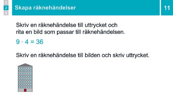 Växla mellan representationsformer Eleverna får träna på att översätta mellan olika representationsformer som ord, bilder och matematiska uttryck, vilket utvecklar deras begreppsliga förståelse för räknesätten – samtidigt som det kräver en viss förståelse för räknesätten. Att t.ex. kunna tolka en händelse eller situation och teckna ett matematiskt uttryck, i syfte att sedan kunna göra en beräkning, är en central och viktig tillämpning av ens förståelse för räknesätten.
