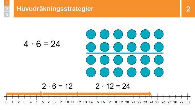 Visa och förklara: ”4 ∙ 6 är ett exempel på en multiplikation som man bör kunna huvudräkna och när man huvudräknar behöver man en bra strategi Vid multiplikation med 4 kan man t ex använda strategin Dubbelt, dubbelt och tänka: Dubbelt så mycket som 6 är 12 och dubbelt så mycket som 12 är 24, alltså är 4 ∙ 6 = 24”