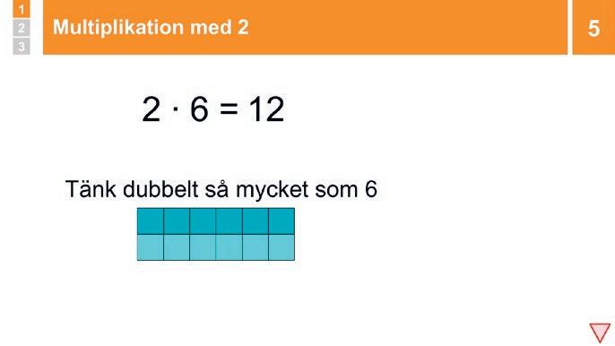 Visa och förklara: ”För att beräkna multiplikationer med 6 så kan man använda strategin Dubbelt så mycket som multiplikation med 3 Då tänker man så här: Om 3 ∙ 7 = 21 så måste 6 ∙ 7 vara dubbelt så mycket, alltså 42.”