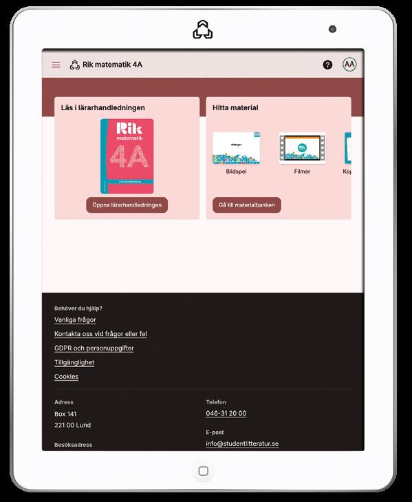 I Rik matematik 4A Lärarpaket ingår utöver den tryckta lärarhandledningen även en digital lärarhandledning med tillgång till förberedda uppdrag i Tomoyo, en digital spelifierad färdighetsträning.