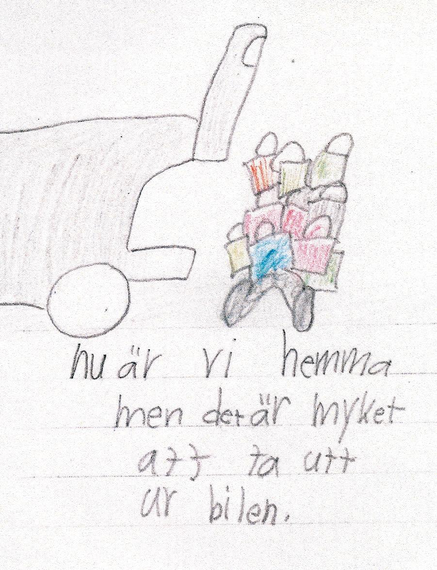 Figur 8.4 Med hjälp av bilder har eleven förtydligat sin berättelse. I den högra bilden illustreras hur bråttom de har och i den vänstra hur mycket de var tvungna att bära in efter sin shoppingrunda.
