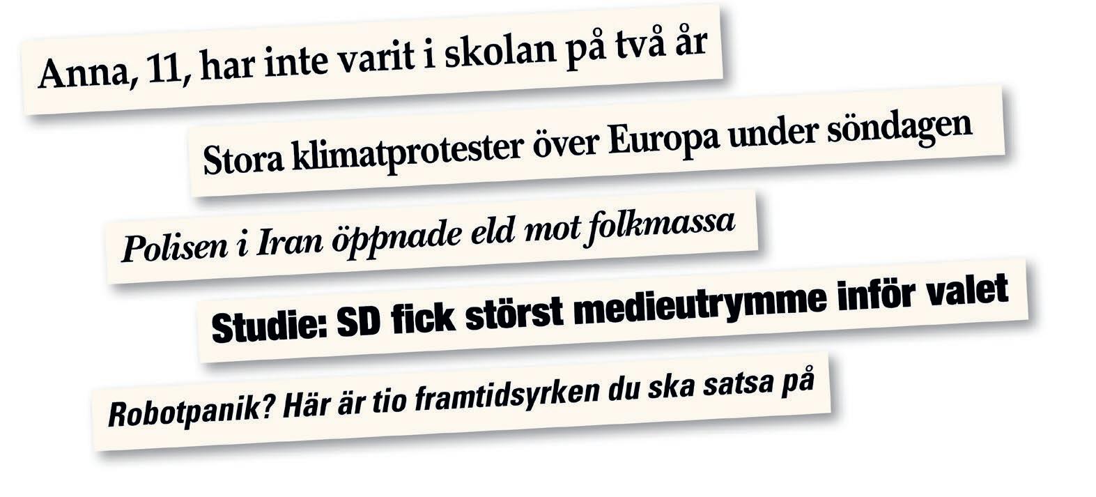 Intervjua personer och dela ut enkäter på skolan eller på praktikplatsen – eller genom att använda globlalis.se, amnesty.se, landguiden.se eller sakerhetspolitik.se, om du vill skaffa material om ett annat land eller en konflikt i världen. Vilken metod som passar beror på vilka artiklar du väljer. Skriv sedan en text på 2–3 sidor om vad du kommer fram till.