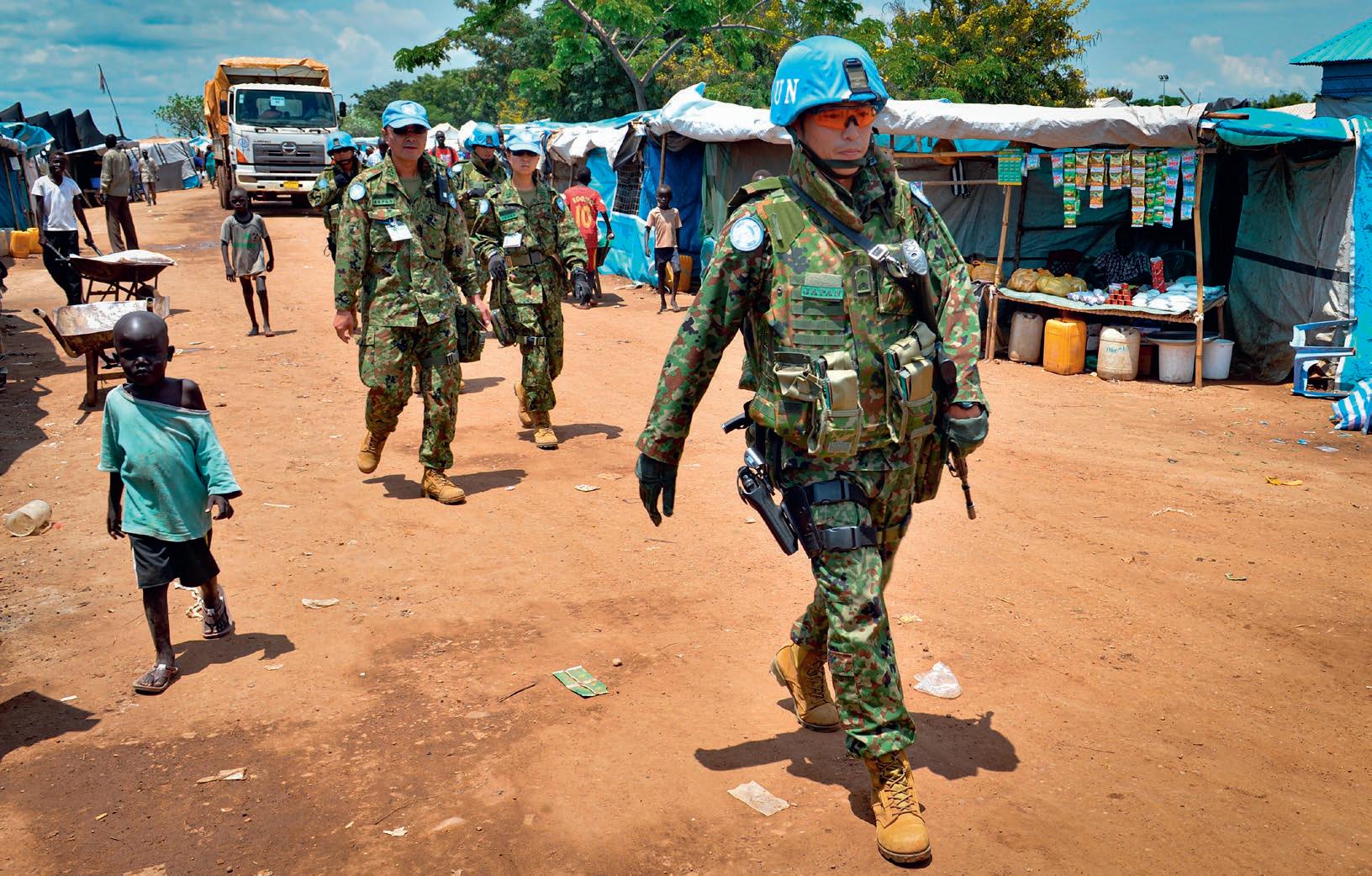 FN:s fredsbevarande styrkor sätts in för att skydda civilbefolkningen och för att förhindra att konflikter trappas upp. Här är japanska FN-soldater på uppdrag i Sydsudan.