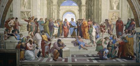 1.2 Platon i diskussion med sin lärjunge Aristoteles vid Akademin i Aten. Väggmålning i Vatikanen av Rafael, från 1508.