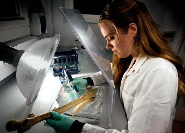 Här tas prover på ett skelett för att med metoden kol14 ta reda på hur gammalt benet är.