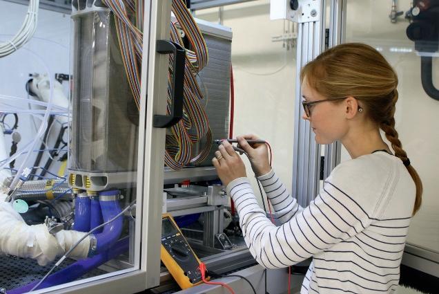 En forskare mäter spänningen i en ny typ av spänningskälla, en bränslecell.