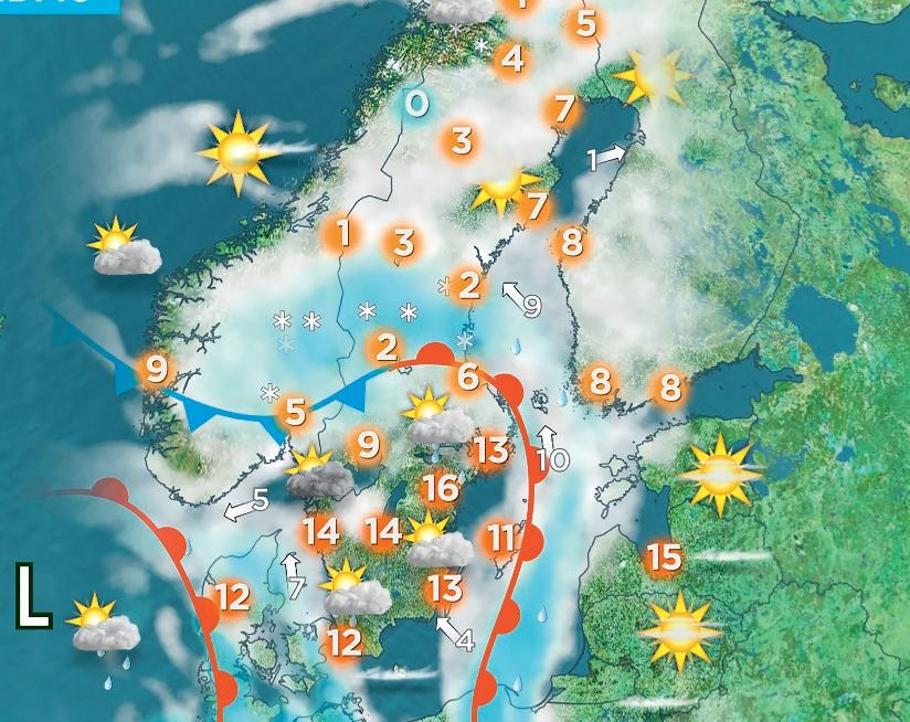 väderkartan visar hur luft med olika temperatur rör sig. röda linjen visar att varm luft rör sig upp över Östersjön mot norra Sverige. den blå linjen visar kall luft med snö som rör sig söder ut i både norge och Sverige. i norra Sverige är det molnigt. i södra Sverige är det mer sol. Ute på nordsjön finns ett lågtryck med risk för regn.
