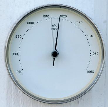 en barometer mäter lufttrycket. den här dagen är lufttrycket i staden Skara 1013 hPa. (Se på den grå visaren, den svarta ställer man in själv för att jämföra lufttrycket från en dag till nästa.)