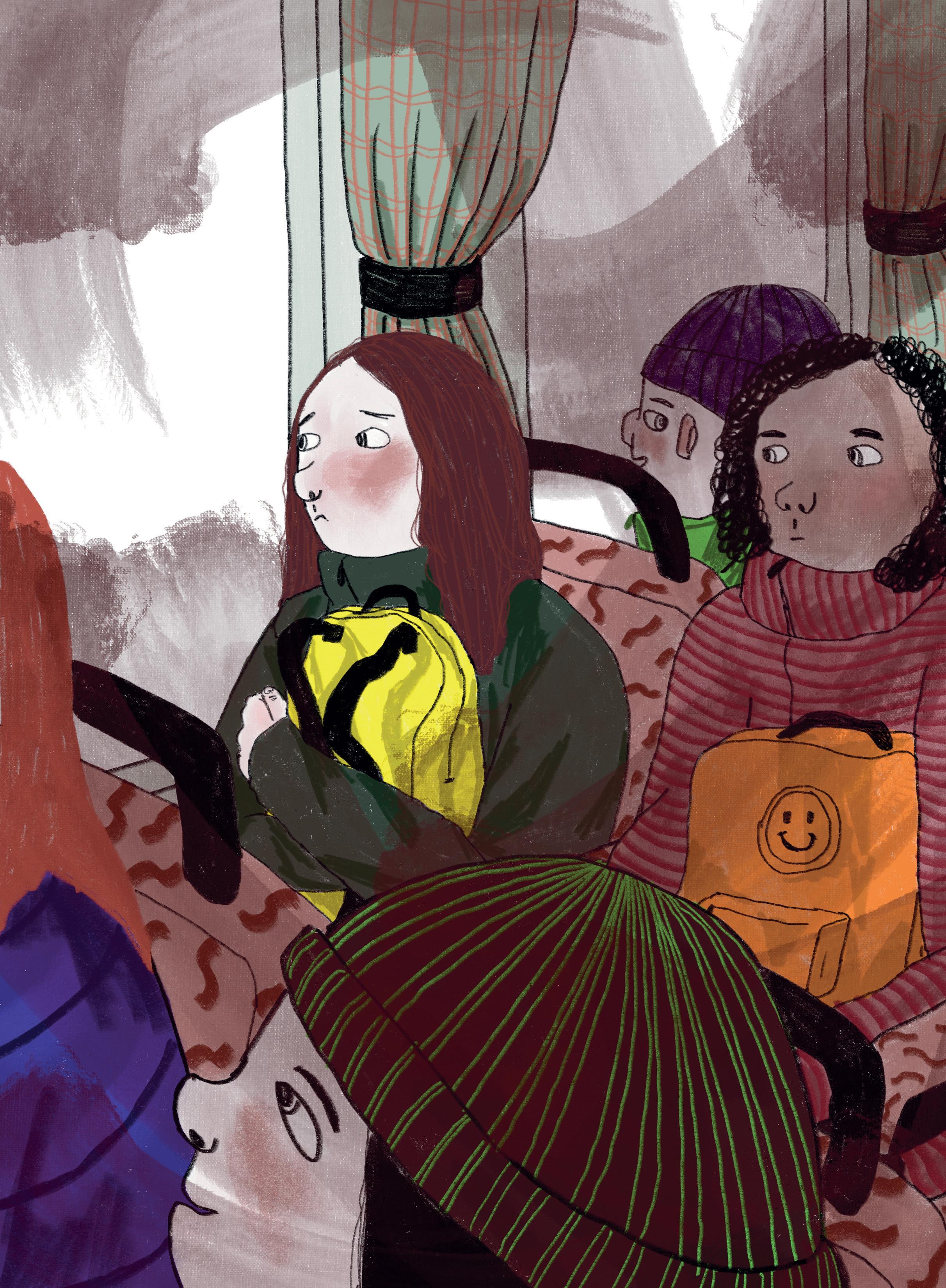 Det börjar på bussen. Jag har ont i magen, det har jag alla onsdagar. Ryggsäcken får inte plats vid fötterna så jag har den i knät, det är en gulsvart och jätteful. Egentligen tycker jag inte att gult är fult, men det måste vara RÄTT gul. Inte sån här gul, som neon. Helst skulle den varit ockragul, för det är pappas favoritfärg. Han är konstnär så han vet sånt. Pappa gillar Beatles och öl. Mamma gillar inte Beatles, och inte öl heller. Det är nog tur att dom inte är ihop längre.