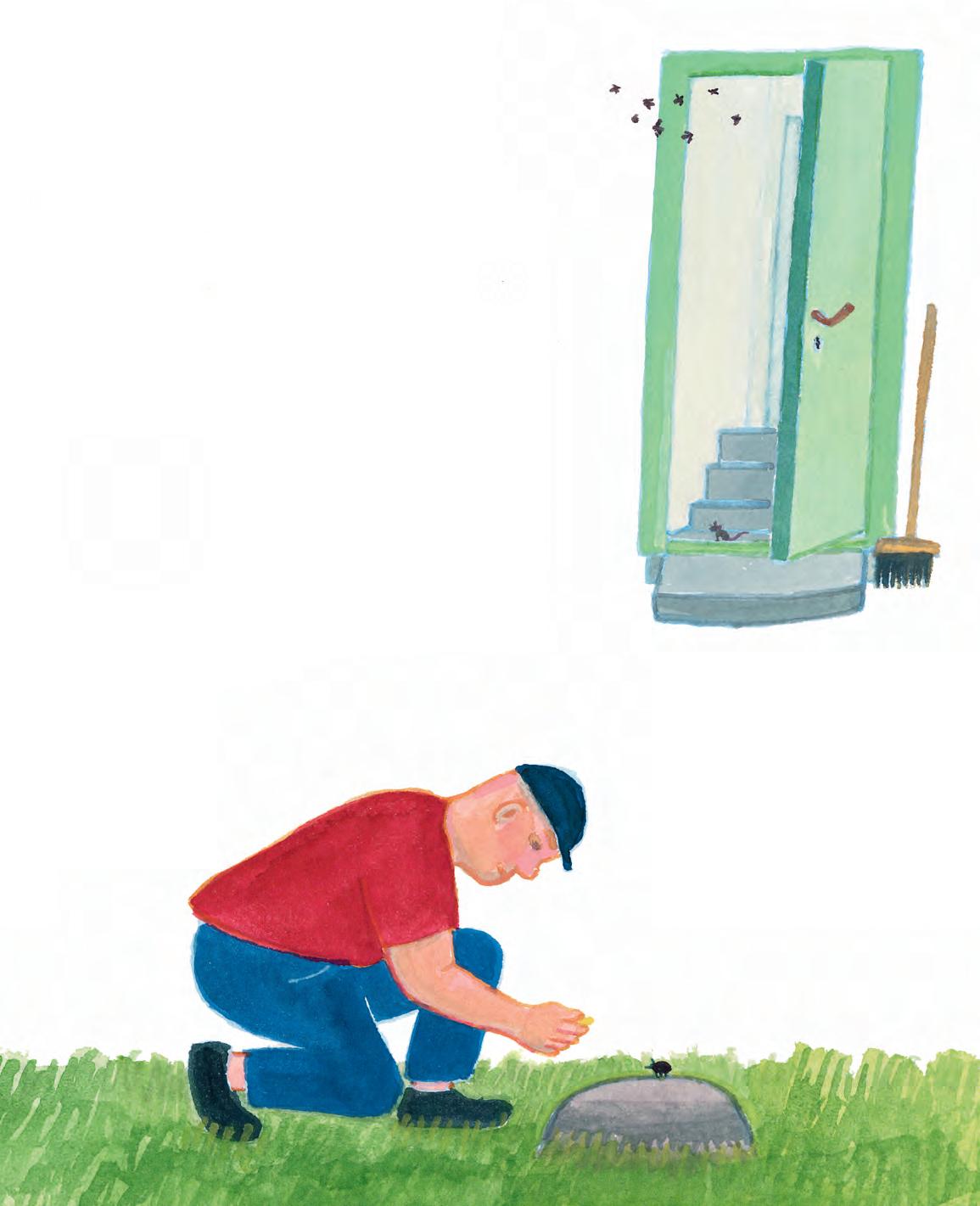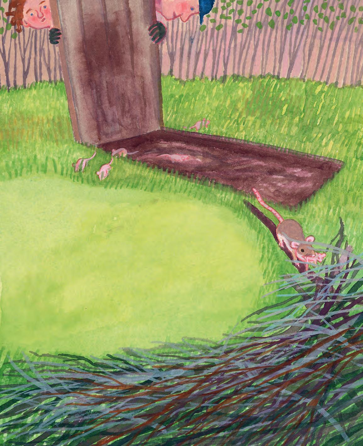 När vi lyfter bort en gammal dörr som legat länge på marken, då skrämmer vi en musfamilj som bosatt sig där.