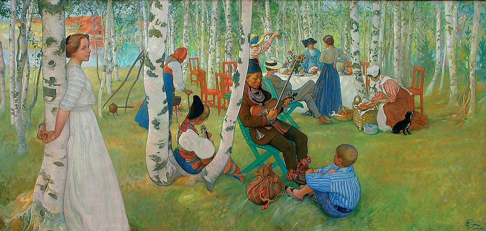 Frukost i det gröna av Carl Larsson. Tavlan visar hur samer kunde användas som ett exotiserande inslag i den tidens nationalromantiska måleri. Bakom finns dock en mörkare historia. Samen är en så kallad »sockenlapp«, en spillra av en ursprungligen mycket större samisk befolkning i Mellansverige som tvingats bort under 1600- och 1700-talet.