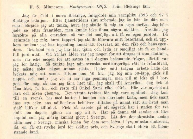 utredningen och berätta om sina liv och emigrationsbeslut. Här följer ett brev från en man som arbetade på ett sågverk i Minnesota: