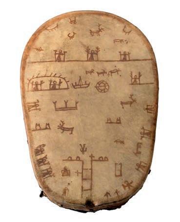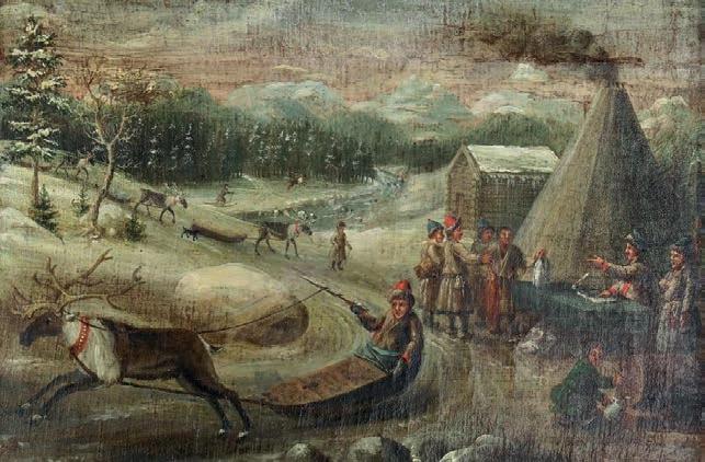 Denna oljemålning från tidigt 1700tal visar skatteuppbörd hos samerna. Länge utgick samernas skatter främst i skinn och torkad fisk, men också hantverksarbeten som »lappskor« kunde ingå. Samiska varor var eftertraktade i Europa.