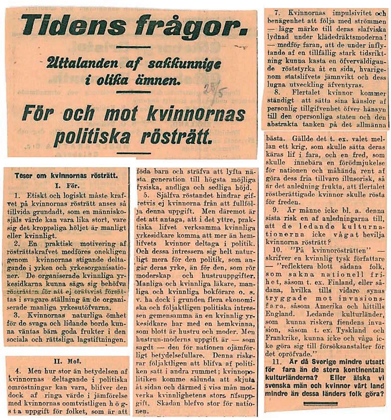 i hela landet och 1913 påbörjades en namninsamling där kvinnorna krävde full medborgarrätt. Samma år inledde tidningen Nya Dagligt Allehanda en debatt kring kvinnlig rösträtt där argumenten för och emot spaltades upp. Här är ett utdrag ur denna artikel.